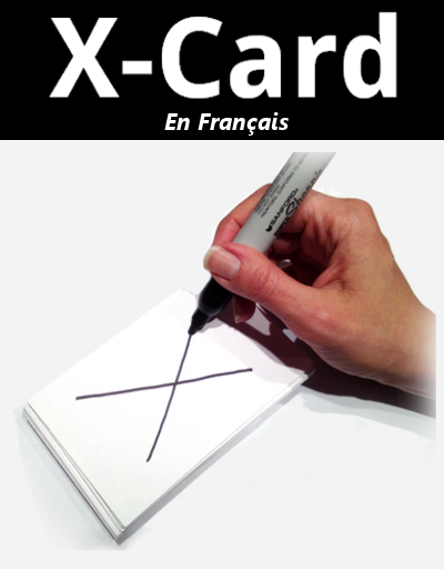 Je ne trouve pas «Carte-X» agréable que ce soit visuellement ou à entendre, et étant donner que le nom de X-Card est lié à un concept fort, j’ai préféré le garder tel quel comme s’il s’agissait du nom d’un produit ou d’une marque déposé.
