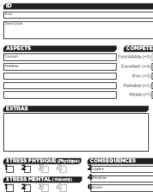 - Une feuille de personnage, une par joueur, et du papier en plus pour prendre des notes. Nous expliquerons le contenu de la feuille de personnage plus bas (MJ, tous les personnages importants que vous jouez peuvent aussi avoir une feuille similaire).